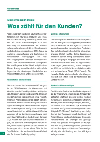 10GartentrendsMarketmedia24-StudieWas z%u00e4hlt f%u00fcr den Kunden?Was bewegt den Kunden im Baumarkt oder Gartencenter zum Kauf eines Produkts? Eine Frage, der sich H%u00e4ndler stetig und st%u00e4ndig stellen m%u00fcssen. F%u00fcr seinen Consumer-Report 2024 Garden-Living hat Marketmedia24, ein Marktforschungsunternehmen mit Sitz in K%u00f6ln, eine repr%u00e4sentative Online-Umfrage in der DACH-Region zu geplanten Anschaffungen und Kaufkriterien in verschiedenen Warengruppen des Garden-Living-Segments sowie den beliebtesten Einkaufs- und Informationskan%u00e4len durchgef%u00fchrt. Der nachfolgende Artikel bildet lediglich einen kleinen Auszug ab und beschr%u00e4nkt sich auf die Ergebnisse der abgefragten Kaufkriterien von Outdoor-M%u00f6beln, Grills und Sonnenschirmen.Qualit%u00e4t steht an erster StelleWenn es um den Kauf von Outdoor-M%u00f6beln geht, ist den DACH-Bewohner aller Altersklassen und Geschlechter die Produktqualit%u00e4t am wichtigsten (60,4 Prozent), gefolgt von Design (40,0 Prozent) und dem Service nach dem Kauf (36,2 Prozent). Unter den Altersklassen gibt es jedoch klare Unterschiede: W%u00e4hrend bei den Youngstern und Mid Agern das Design an zweiter Stelle steht, empfinden die Best Ager die Verf%u00fcgbarkeit beziehungsweise Lieferbarkeit als wichtig. Als zweitst%u00e4rkstes Argument gilt bei den Senioren der Service nach dem Kauf. W%u00e4hrend bei den befragten Senioren 37,5 Prozent Wert auf nat%u00fcrliche Materialien legen, die damit das drittwichtigste Kriterium bilden, findet dieses Argument bei den anderen Altersgruppen nicht einmal einen Platz in den Top-5-Kriterien. Hier werden stattdessen Wert auf den Service und das Design gelegt.Der Preis ist sekund%u00e4rDas Preisargument wiederum ist nur f%u00fcr 30,5 Prozent der Befragten ausschlaggebend, die st%u00e4rkste Gruppe bilden hier die Best Ager %u2013 33,1 Prozent suchen insbesondere nach g%u00fcnstigen Produkten. Eine gute Beratung im Gesch%u00e4ft ist allen Altersgruppen %u00e4hnlich wichtig, Online-Bewertungen wiederum spielen wenig %u00fcberraschend besonders f%u00fcr die j%u00fcngste Zielgruppe eine Rolle. W%u00e4hrend die Senioren mehr Wert auf regionale Produkte legen (25,0 Prozent), achten Youngster verst%u00e4rkt auf zertifizierte Nachhaltigkeitsaspekte und entsprechende Siegel (30,6 Prozent). Die Hersteller-Marke wiederum landet alters%u00fcbergreifend auf dem letzten Platz der Kaufkriterien bei Outdoor-M%u00f6beln.Marken im Alter unwichtigerDeutlich mehr Gewicht hat das Marken-Argument bei der Anschaffung eines Grills: 23,4 Prozent der Befragten empfinden dies als wichtig, Tendenz mit dem Alter abnehmend. Insgesamt f%u00fchren im BBQ-Segment die Produktqualit%u00e4t (54,8 Prozent), der Service nach dem Kauf (38,8 Prozent) und die direkte Verf%u00fcgbarkeit beziehungsweise Lieferf%u00e4higkeit (37,2 Prozent) das Ranking an %u2013 lediglich bei den Youngstern landet das Design auf Platz 2. Ebenso empfindet die j%u00fcngste Gruppe die Hersteller-Marke als wichtiger als g%u00fcnstige Preise. Fast genauso wichtig finden die Youngsters aber die gute Beratung vor Ort, gemeinsam mit den Best Agern und Senioren. Etwas weniger wichtig wird die Beratung von den Mid Agern wahrgenommen.