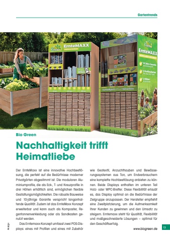 13 AnzeigeGartentrendsBio GreenNachhaltigkeit trifft HeimatliebeDer ErnteMaxx ist eine innovative Hochbeetl%u00f6sung, die perfekt auf die Bed%u00fcrfnisse moderner Privatg%u00e4rten abgestimmt ist. Die modularen Aluminiumprofile, die als Eck-, T- und Kreuzprofile in drei H%u00f6hen erh%u00e4ltlich sind, erm%u00f6glichen flexible Gestaltungsm%u00f6glichkeiten. Die robuste Bauweise und 10-j%u00e4hrige Garantie verspricht langanhaltende Qualit%u00e4t. Zudem ist das ErnteMaxx Konzept erweiterbar und kann auch als Komposter, Regentonnenverkleidung oder als Sandkasten genutzt werden.Das Erntemaxx-Konzept umfasst zwei POS-Displays: eines mit Profilen und eines mit Zubeh%u00f6r wie Geotextil, Anzuchthauben und Bew%u00e4sserungssystemen aus Ton, um Endverbrauchern eine komplette Hochbeetl%u00f6sung anbieten zu k%u00f6nnen. Beide Displays enthalten im unteren Teil Holz- oder WPC-Bretter. Diese Flexibilit%u00e4t erlaubt es, das Display optimal an die Bed%u00fcrfnisse der Zielgruppe anzupassen. Der Hersteller empfiehlt eine Zweitplatzierung, um die Aufmerksamkeit Ihrer Kunden zu gewinnen und den Umsatz zu steigern. Erntemaxx steht f%u00fcr Qualit%u00e4t, Flexibilit%u00e4t und ma%u00dfgeschneiderte L%u00f6sungen %u2013 optimal f%u00fcr den Gesch%u00e4ftserfolg.www.biogreen.de