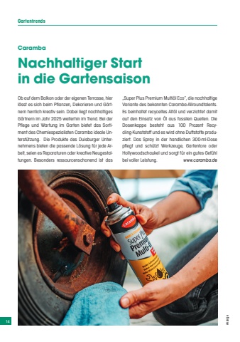 14 AnzeigeGartentrendsCarambaNachhaltiger Start in die GartensaisonOb auf dem Balkon oder der eigenen Terrasse, hier l%u00e4sst es sich beim Pflanzen, Dekorieren und G%u00e4rtnern herrlich kreativ sein. Dabei liegt nachhaltiges G%u00e4rtnern im Jahr 2025 weiterhin im Trend. Bei der Pflege und Wartung im Garten bietet das Sortiment des Chemiespezialisten Caramba ideale Unterst%u00fctzung. Die Produkte des Duisburger Unternehmens bieten die passende L%u00f6sung f%u00fcr jede Arbeit, seien es Reparaturen oder kreative Neugestaltungen. Besonders ressourcenschonend ist das %u201eSuper Plus Premium Multi%u00f6l Eco%u201c, die nachhaltige Variante des bekannten Caramba-Allroundtalents. Es beinhaltet recyceltes Alt%u00f6l und verzichtet damit auf den Einsatz von %u00d6l aus fossilen Quellen. Die Dosenkappe besteht aus 100 Prozent Recycling-Kunststoff und es wird ohne Duftstoffe produziert. Das Spray in der handlichen 300-ml-Dose pflegt und sch%u00fctzt Werkzeuge, Gartentore oder Hollywoodschaukel und sorgt f%u00fcr ein gutes Gef%u00fchl bei voller Leistung. www.caramba.de