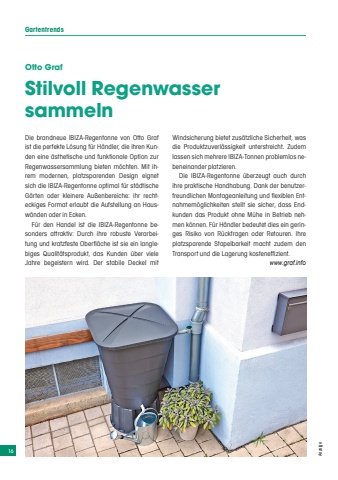 16 AnzeigeGartentrendsOtto GrafStilvoll Regenwasser sammelnDie brandneue IBIZA-Regentonne von Otto Graf ist die perfekte L%u00f6sung f%u00fcr H%u00e4ndler, die ihren Kunden eine %u00e4sthetische und funktionale Option zur Regenwassersammlung bieten m%u00f6chten. Mit ihrem modernen, platzsparenden Design eignet sich die IBIZA-Regentonne optimal f%u00fcr st%u00e4dtische G%u00e4rten oder kleinere Au%u00dfenbereiche: ihr rechteckiges Format erlaubt die Aufstellung an Hausw%u00e4nden oder in Ecken.F%u00fcr den Handel ist die IBIZA-Regentonne besonders attraktiv: Durch ihre robuste Verarbeitung und kratzfeste Oberfl%u00e4che ist sie ein langlebiges Qualit%u00e4tsprodukt, das Kunden %u00fcber viele Jahre begeistern wird. Der stabile Deckel mit Windsicherung bietet zus%u00e4tzliche Sicherheit, was die Produktzuverl%u00e4ssigkeit unterstreicht. Zudem lassen sich mehrere IBIZA-Tonnen problemlos nebeneinander platzieren.Die IBIZA-Regentonne %u00fcberzeugt auch durch ihre praktische Handhabung. Dank der benutzerfreundlichen Montageanleitung und flexiblen Entnahmem%u00f6glichkeiten stellt sie sicher, dass Endkunden das Produkt ohne M%u00fche in Betrieb nehmen k%u00f6nnen. F%u00fcr H%u00e4ndler bedeutet dies ein geringes Risiko von R%u00fcckfragen oder Retouren. Ihre platzsparende Stapelbarkeit macht zudem den Transport und die Lagerung kosteneffizient.www.graf.info