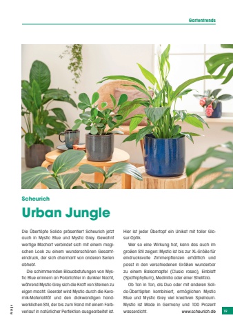 19 AnzeigeGartentrendsScheurichUrban JungleDie %u00dcbert%u00f6pfe Solido pr%u00e4sentiert Scheurich jetzt auch in Mystic Blue und Mystic Grey. Gewohnt wertige Machart verbindet sich mit einem magischen Look zu einem wundersch%u00f6nen Gesamteindruck, der sich charmant von anderen Serien abhebt.Die schimmernden Blauabstufungen von Mystic Blue erinnern an Polarlichter in dunkler Nacht, w%u00e4hrend Mystic Grey sich die Kraft von Steinen zu eigen macht. Geerdet wird Mystic durch die Keramik-Materialit%u00e4t und den dickwandigen handwerklichen Stil, der bis zum Rand mit einem Farbverlauf in nat%u00fcrlicher Perfektion ausgearbeitet ist. Hier ist jeder %u00dcbertopf ein Unikat mit toller Glasur-Optik.Wer so eine Wirkung hat, kann das auch im gro%u00dfen Stil zeigen: Mystic ist bis zur XL-Gr%u00f6%u00dfe f%u00fcr eindrucksvolle Zimmerpflanzen erh%u00e4ltlich und passt in den verschiedenen Gr%u00f6%u00dfen wunderbar zu einem Balsamapfel (Clusia rosea), Einblatt (Spathiphyllum), Medinilla oder einer Strelitzia.Ob Ton in Ton, als Duo oder mit anderen Solido-%u00dcbert%u00f6pfen kombiniert, erm%u00f6glichen Mystic Blue und Mystic Grey viel kreativen Spielraum. Mystic ist Made in Germany und 100 Prozent wasserdicht. www.scheurich.de