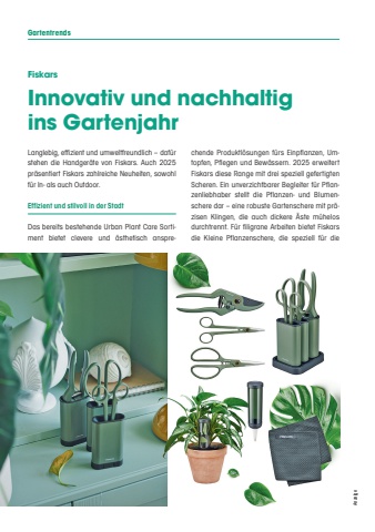 AnzeigeGartentrendsFiskarsInnovativ und nachhaltig ins GartenjahrLanglebig, effizient und umweltfreundlich %u2013 daf%u00fcr stehen die Handger%u00e4te von Fiskars. Auch 2025 pr%u00e4sentiert Fiskars zahlreiche Neuheiten, sowohl f%u00fcr In- als auch Outdoor.Effizient und stilvoll in der StadtDas bereits bestehende Urban Plant Care Sortiment bietet clevere und %u00e4sthetisch ansprechende Produktl%u00f6sungen f%u00fcrs Einpflanzen, Umtopfen, Pflegen und Bew%u00e4ssern. 2025 erweitert Fiskars diese Range mit drei speziell gefertigten Scheren. Ein unverzichtbarer Begleiter f%u00fcr Pflanzenliebhaber stellt die Pflanzen- und Blumenschere dar %u2013 eine robuste Gartenschere mit pr%u00e4zisen Klingen, die auch dickere %u00c4ste m%u00fchelos durchtrennt. F%u00fcr filigrane Arbeiten bietet Fiskars die Kleine Pflanzenschere, die speziell f%u00fcr die