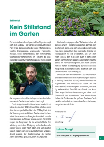 3EditorialKein Stillstand im GartenEin turbulentes Jahr mit gemischten Signalen neigt sich dem Ende zu %u2013 es war ein weiteres Jahr in der Poly-Krise. Langanhaltende hohe Inflationsraten, volatile Energiepreise, wachsender Fachkr%u00e4ftemangel, hohe Rohstoffpreise, der Klimawandel, wechselnde Wetterextreme im Fr%u00fchjahr, die stagnierende Gesamtwirtschaftslage und nicht zuletzt die angespannte politische Lage haben den Unternehmen in Deutschland vieles abverlangt.Doch einige dieser Probleme boten bereits Lichtblicke f%u00fcr das Jahr 2025. Obwohl die Inflation noch %u00fcber dem angestrebten Wert der EZB liegt, hat sich die Teuerungsrate stabilisiert. Deutschland hat verst%u00e4rkt in erneuerbare Energien investiert, um die Energiekosten auf Dauer einzupendeln. F%u00fcr 2025 zeigen die Prognosen f%u00fcr die wirtschaftliche Entwicklung nach dem R%u00fcckgang im laufenden Jahr schon wieder leicht nach oben. Die Verbraucher jedoch haben sich davon zun%u00e4chst recht unbeeindruckt gezeigt, der Reallohnverlust der letzten Jahre scheint zu gro%u00df, die Zeiten zu ungewiss. Und doch, entgegen aller Wetterkapriolen, wider den Sturm %u2013 langfristig gesehen geht es dem Garten gut. Denn, wie sich schon %u00fcber die Pandemie-Jahre gezeigt hat: Das heimische Gr%u00fcn ist ein R%u00fcckzugsort f%u00fcr die Deutschen. Ein Ort zum Kraft-Tanken, den man sich auch in schlechten Zeiten nicht nehmen lassen und erhalten m%u00f6chte. Selbst im Hartwarensegment, das nach Corona mit der hohen Marks%u00e4ttigung durch den Cocooning-Trend zu k%u00e4mpfen hatte, zeichnet sich wieder ein leichter Aufschwung ab.Und auch dem Klimawandel %u2013 so zerst%u00f6rerisch er in seinen tats%u00e4chlichen Auswirkungen auch ist %u2013 vermag man (fast schon) etwas Positives abzugewinnen. Die Verbraucher haben ein Bewusstsein f%u00fcr Nachhaltigkeit entwickelt, das stetig weiterw%u00e4chst. Das %u00fcbt zwar Druck aus, kann %u00fcber kluge Sortimentsanpassungen aber auch Chance f%u00fcr den Handel sein. Denn letzten Endes haben die Endkunden ihr %u201egr%u00fcnes Gewissen%u201c entdeckt %u2013 und mit nichts kann diese Branche besser umgehen als mit Gr%u00fcn.Herzlichst IhrLukas GanglLukas GanglTel. 0 72 43/575-203 %u2022 l.gangl@daehne.de Foto: D%u00e4hne Verlag, Gangl