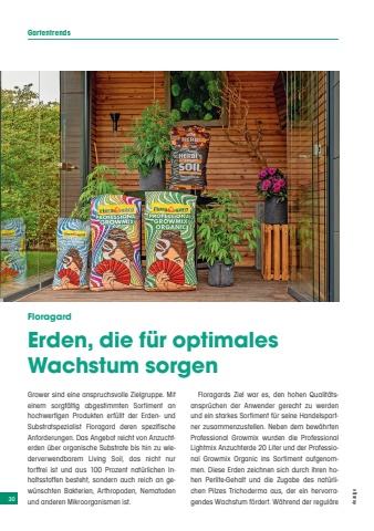 30 AnzeigeGartentrendsFloragardErden, die f%u00fcr optimales Wachstum sorgenGrower sind eine anspruchsvolle Zielgruppe. Mit einem sorgf%u00e4ltig abgestimmten Sortiment an hochwertigen Produkten erf%u00fcllt der Erden- und Substratspezialist Floragard deren spezifische Anforderungen. Das Angebot reicht von Anzuchterden %u00fcber organische Substrate bis hin zu wiederverwendbarem Living Soil, das nicht nur torffrei ist und aus 100 Prozent nat%u00fcrlichen Inhaltsstoffen besteht, sondern auch reich an gew%u00fcnschten Bakterien, Arthropoden, Nematoden und anderen Mikroorganismen ist.Floragards Ziel war es, den hohen Qualit%u00e4tsanspr%u00fcchen der Anwender gerecht zu werden und ein starkes Sortiment f%u00fcr seine Handelspartner zusammenzustellen. Neben dem bew%u00e4hrten Professional Growmix wurden die Professional Lightmix Anzuchterde 20 Liter und der Professional Growmix Organic ins Sortiment aufgenommen. Diese Erden zeichnen sich durch ihren hohen Perlite-Gehalt und die Zugabe des nat%u00fcrlichen Pilzes Trichoderma aus, der ein hervorragendes Wachstum f%u00f6rdert. W%u00e4hrend der regul%u00e4re