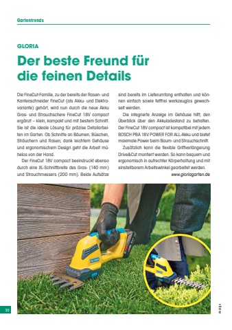 32 AnzeigeGartentrendsGLORIADer beste Freund f%u00fcr die feinen DetailsDie FineCut-Familie, zu der bereits der Rasen- und Kantenschneider FineCut (als Akku- und Elektrovariante) geh%u00f6rt, wird nun durch die neue Akku Gras- und Strauchschere FineCut 18V compact erg%u00e4nzt %u2013 klein, kompakt und mit bestem Schnitt. Sie ist die ideale L%u00f6sung f%u00fcr pr%u00e4zise Detailarbeiten im Garten. Ob Schnitte an B%u00e4umen, B%u00fcschen, Str%u00e4uchern und Rasen, dank leichtem Geh%u00e4use und ergonomischem Design geht die Arbeit m%u00fchelos von der Hand.Der FineCut 18V compact beeindruckt ebenso durch eine XL-Schnittbreite des Gras- (140 mm) und Strauchmessers (200 mm). Beide Aufs%u00e4tze sind bereits im Lieferumfang enthalten und k%u00f6nnen einfach sowie fettfrei werkzeuglos gewechselt werden.Die integrierte Anzeige im Geh%u00e4use hilft, den %u00dcberblick %u00fcber den Akkuladestand zu behalten. Der FineCut 18V compact ist kompatibel mit jedem BOSCH PBA 18V POWER FOR ALL-Akku und bietet maximale Power beim Baum- und Strauchschnitt.Zus%u00e4tzlich kann die flexible Griffverl%u00e4ngerung Drive&Cut montiert werden. So kann bequem und ergonomisch in aufrechter K%u00f6rperhaltung und mit einstellbarem Arbeitswinkel gearbeitet werden.www.gloriagarten.de