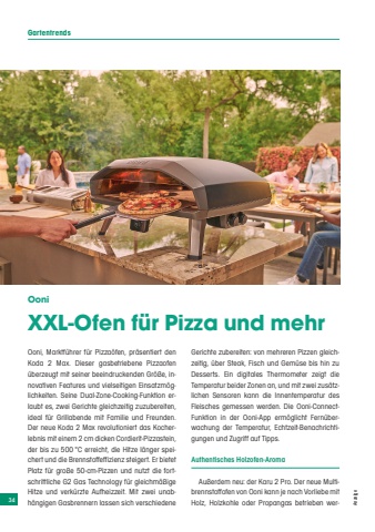 34 AnzeigeGartentrendsOoniXXL-Ofen f%u00fcr Pizza und mehrOoni, Marktf%u00fchrer f%u00fcr Pizza%u00f6fen, pr%u00e4sentiert den Koda 2 Max. Dieser gasbetriebene Pizzaofen %u00fcberzeugt mit seiner beeindruckenden Gr%u00f6%u00dfe, innovativen Features und vielseitigen Einsatzm%u00f6glichkeiten. Seine Dual-Zone-Cooking-Funktion erlaubt es, zwei Gerichte gleichzeitig zuzubereiten, ideal f%u00fcr Grillabende mit Familie und Freunden. Der neue Koda 2 Max revolutioniert das Kocherlebnis mit einem 2 cm dicken Cordierit-Pizzastein, der bis zu 500 %u00b0C erreicht, die Hitze l%u00e4nger speichert und die Brennstoffeffizienz steigert. Er bietet Platz f%u00fcr gro%u00dfe 50-cm-Pizzen und nutzt die fortschrittliche G2 Gas Technology f%u00fcr gleichm%u00e4%u00dfige Hitze und verk%u00fcrzte Aufheizzeit. Mit zwei unabh%u00e4ngigen Gasbrennern lassen sich verschiedene Gerichte zubereiten: von mehreren Pizzen gleichzeitig, %u00fcber Steak, Fisch und Gem%u00fcse bis hin zu Desserts. Ein digitales Thermometer zeigt die Temperatur beider Zonen an, und mit zwei zus%u00e4tzlichen Sensoren kann die Innentemperatur des Fleisches gemessen werden. Die Ooni- ConnectFunktion in der Ooni-App erm%u00f6glicht Fern%u00fcberwachung der Temperatur, Echtzeit-Benachrichtigungen und Zugriff auf Tipps.Authentisches Holzofen-AromaAu%u00dferdem neu: der Karu 2 Pro. Der neue Multibrennstoffofen von Ooni kann je nach Vorliebe mit Holz, Holzkohle oder Propangas betrieben wer