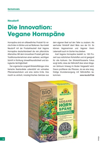 36 AnzeigeGartentrendsNeudorffDie Innovation: Vegane Hornsp%u00e4neHornsp%u00e4ne sind ein altbew%u00e4hrtes Produkt f%u00fcr reiche Ernten in G%u00e4rten und auf Balkonen. Nun bietet Neudorff mit der Produktneuheit Azet Vegane Hornsp%u00e4ne deutschlandweit die rein pflanzliche Alternative. Mit dem innovativen Produkt geht das Traditionsunternehmen einen weiteren, wichtigen Schritt in Richtung Umweltfreundlichkeit und biologische Vertr%u00e4glichkeit. Der organische Langzeit-Stickstoffd%u00fcnger ohne tierische Bestandteile unterst%u00fctzt ein schnelles Pflanzenwachstum und eine reiche Ernte. Das macht es einfach, knackig-frisches Gem%u00fcse aus dem eigenen Beet auf den Teller zu zaubern. Als wertvoller Rohstoff dient Mais aus der EU. So k%u00f6nnen Veganerinnen und Veganer ihrem Lebensstil auch im Garten treu bleiben. Azet Vegane Hornsp%u00e4ne besteht zu 100 Prozent aus nat%u00fcrlichen Rohstoffen und ist geeignet f%u00fcr alle Kulturen. Der Stickstoff-basierte Fokus sorgt daf%u00fcr, dass der N%u00e4hrstoff %u00fcber einen l%u00e4ngeren Zeitraum hinweg im Boden freigesetzt wird. Davon profitieren die Pflanzen, da sie eine langfristige Grundversorgung mit N%u00e4hrstoffen bekommen. www.neudorff.de