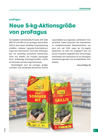 37 AnzeigeGartentrendsproFagusNeue 5-kg-Aktionsgr%u00f6%u00dfe von proFagusDie beliebten Grill-Holzkohle-Produkte DER SOMMER HIT und GRiLLiS von proFagus sind ab M%u00e4rz 2025 in einer neuen, attraktiven 5-kg-Verpackung erh%u00e4ltlich %u2013 inklusive 1 kg gratis! Damit bietet proFagus den Verbrauchern noch mehr Grillvergn%u00fcgen mit nachhaltig produzierter Buchen-Holzkohle und -Briketts. Die Produkte %u00fcberzeugen durch erstklassige Brenneigenschaften, schnelles Anz%u00fcnden und eine lange Brenndauer.Nachhaltigkeit wird bei proFagus gro%u00dfgeschrieben: Das verwendete Buchenholz stammt ausschlie%u00dflich aus regionaler, zertifizierter Forstwirtschaft. Zudem produziert das Unternehmen im umweltschonenden Retortenverfahren und kann sich seit 2022 sogar als CO2-negativ bezeichnen, da mehr CO2 eingespart wird, als bei der Produktion freigesetzt wird. Mit proFagus entscheiden sich Verbraucher f%u00fcr ein %u00f6kologisch verantwortungsvolles und schadstofffreies Grillerlebnis.www.profagus.de