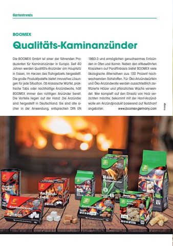 GartentrendsAnzeigeBOOMEXQualit%u00e4ts-Kaminanz%u00fcnderDie BOOMEX GmbH ist einer der f%u00fchrenden Produzenten f%u00fcr Kaminanz%u00fcnder in Europa. Seit 40 Jahren werden Qualit%u00e4ts-Anz%u00fcnder am Hauptsitz in Essen, im Herzen des Ruhrgebiets hergestellt. Die gro%u00dfe Produktpalette bietet innovative L%u00f6sungen f%u00fcr jede Situation. Ob klassische W%u00fcrfel, praktische Tabs oder nachhaltige Anz%u00fcndwolle, h%u00e4lt BOOMEX immer den richtigen Anz%u00fcnder bereit. Die Vorteile liegen auf der Hand: Die Anz%u00fcnder sind hergestellt in Deutschland. Sie sind alle sicher in der Anwendung, entsprechen DIN EN 1860-3 und erm%u00f6glichen geruchsarmes Entz%u00fcnden in Ofen und Kamin. Neben den altbew%u00e4hrten Klassikern auf Paraffinbasis bietet BOOMEX viele %u00f6kologische Alternativen aus 100 Prozent nachwachsenden Rohstoffen. F%u00fcr %u00d6ko-Anz%u00fcndw%u00fcrfeln und %u00d6ko-Anz%u00fcndwolle werden ausschlie%u00dflich zertifizierte H%u00f6lzer und pflanzliches Wachs verwendet. Wer komplett auf den Einsatz von Holz verzichten m%u00f6chte, bekommt mit der Hanf-Anz%u00fcndwolle ein Anz%u00fcndprodukt basierend auf Nutzhanf angeboten. www.boomex-germany.com