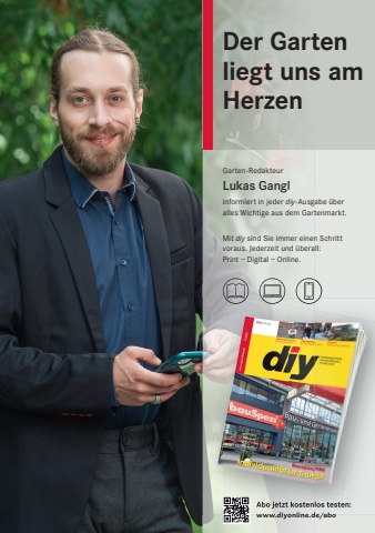Der Garten liegt uns am HerzenAbo jetzt kostenlos testen:www.diyonline.de/aboGarten-RedakteurLukas Ganglinformiert in jeder diy-Ausgabe %u00fcber alles Wichtige aus dem Gartenmarkt.Mit diy sind Sie immer einen Schrittvoraus. Jederzeit und %u00fcberall:Print %u2013 Digital %u2013 Online.Abo jetzt kostenlos testen:www.diyonline.de/abo