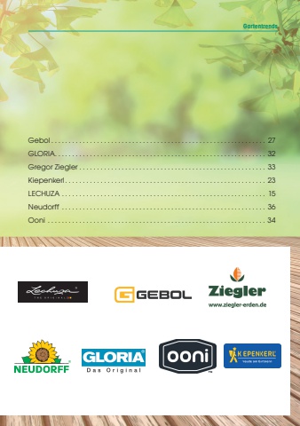 GartentrendsGebol . . . . . . . . . . . . . . . . . . . . . . . . . . . . . . . . . . . . . . . . . . . . . . . . . . . . . . . . . . . . . 27GLORIA. . . . . . . . . . . . . . . . . . . . . . . . . . . . . . . . . . . . . . . . . . . . . . . . . . . . . . . . . . . . 32Gregor Ziegler . . . . . . . . . . . . . . . . . . . . . . . . . . . . . . . . . . . . . . . . . . . . . . . . . . . . . 33Kiepenkerl . . . . . . . . . . . . . . . . . . . . . . . . . . . . . . . . . . . . . . . . . . . . . . . . . . . . . . . . . 23LECHUZA. . . . . . . . . . . . . . . . . . . . . . . . . . . . . . . . . . . . . . . . . . . . . . . . . . . . . . . . . . 15Neudorff . . . . . . . . . . . . . . . . . . . . . . . . . . . . . . . . . . . . . . . . . . . . . . . . . . . . . . . . . . 36Ooni . . . . . . . . . . . . . . . . . . . . . . . . . . . . . . . . . . . . . . . . . . . . . . . . . . . . . . . . . . . . . . 34