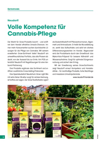 12AnzeigeGartentrendsNeudorffVolle Kompetenz f%u00fcr Cannabis-PflegeDer Markt f%u00fcr Grow-Produkte boomt %u2013 und er%u00f6ffnet dem Handel attraktive Umsatz-Chancen. Immer mehr Konsumenten suchen durchdachte L%u00f6sungen f%u00fcr die Pflege von Cannabis. Mit seinem erweiterten Grow-Sortiment liefert Neudorff ein umweltfreundliches Portfolio, das alle Phasen abdeckt, von der Aussaat bis zur Ernte. Am POS unterst%u00fctzt Neudorff mit Regall%u00f6sungen f%u00fcr eine Verbund-Platzierung.Drei Produkte erg%u00e4nzen das Sortiment und er%u00f6ffnen zus%u00e4tzliche Cross-Selling-Potenziale: Das Spezialsubstrat NeudoHum Grow Light Mix mit extra feiner Struktur sorgt f%u00fcr sichere Keimung, ist torffrei und vegan. Der Grow RootActivator agiert als Bodenhilfsstoff mit Pflanzenhormonen, Algenmehl und Aminos%u00e4uren. Er treibt die Wurzelbildung an, senkt das Auflaufrisiko und setzt ein starkes Differenzierungszeichen im Handel. Abgerundet wird die Produktserie durch den GrowBoost: das Mykorrhiza-Pr%u00e4parat f%u00fcr bessere N%u00e4hrstoff- und Wasseraufnahme. Sorgt f%u00fcr optimale D%u00fcngerausnutzung und sichert den Ertrag.Mit der Erweiterung seines Grow-Sortiments zeigt Neudorff erneut Kompetenz und Handelsst%u00e4rke %u2013 f%u00fcr nachhaltige Produkte, hohe Nachfrage und messbare Umsatzpotenziale.www.neudorff-handel.de