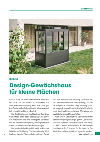 17AnzeigeGartentrendsBiohortDesign-Gew%u00e4chshaus f%u00fcr kleine Fl%u00e4chenBiohort hatte mit dem Gew%u00e4chshaus Florentina ein klares Ziel: ein Produkt zu entwickeln, das auch Menschen mit wenig Platz oder ohne gro%u00dfen Garten vollen Nutzen bietet %u2013 selbstverst%u00e4ndlich in bew%u00e4hrter Biohort-Qualit%u00e4t. Die Kombination aus Hochbeet und Gew%u00e4chshausaufsatz bietet ideale Bedingungen f%u00fcr gesundes Wachstum und eine verl%u00e4ngerte Gartensaison. So entsteht ein kompakter, vielseitig nutzbarer Raum f%u00fcr unterschiedlichste Bepflanzungen. F%u00fcr maximale Funktionalit%u00e4t steht praktisches Zubeh%u00f6r zur Verf%u00fcgung: Eine Rankhilfe unterst%u00fctzt hochwachsende Pflanzen beim sicheren Gedeihen. Die automatische Bel%u00fcftung %u00f6ffnet die beiden Dachfl%u00e4chenfenster selbstst%u00e4ndig, sobald die Temperatur im Inneren steigt und sorgt so f%u00fcr ein ausgeglichenes Klima. Erg%u00e4nzt wird das Sortiment durch seitlich montierbare Pflanzt%u00f6pfe, die zus%u00e4tzliche Anbaufl%u00e4che schaffen. Auch optisch %u00fcberzeugt das Gew%u00e4chshaus: Mit seinem einzigartigen Design, glatten Oberfl%u00e4chen und ohne sichtbare Schrauben wird es zum Designobjekt in jedem Au%u00dfenbereich. Auf bestehende Hochbeete in 2 %u00d7 0,5 m und 2 %u00d7 1 m kann der Gew%u00e4chshausaufsatz einfach nachger%u00fcstet werden. www.biohort.com