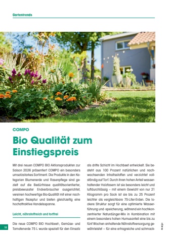 18AnzeigeGartentrendsCOMPOBio Qualit%u00e4t zum EinstiegspreisMit drei neuen COMPO BIO Aktionsprodukten zur Saison 2026 pr%u00e4sentiert COMPO ein besonders umsatzstarkes Sortiment. Die Produkte in den Kategorien Blumenerde und Rasenpflege sind gezielt auf die Bed%u00fcrfnisse qualit%u00e4tsorientierter, preisbewusster Endverbraucher ausgerichtet, vereinen hochwertige Bio-Qualit%u00e4t mit einer nachhaltigen Rezeptur und bieten gleichzeitig eine hochattraktive Handelsspanne.Leicht, n%u00e4hrstoffreich und torffreiDie neue COMPO BIO Hochbeet-, Gem%u00fcse- und Tomatenerde 75 L wurde speziell f%u00fcr den Einsatz als dritte Schicht im Hochbeet entwickelt. Sie besteht aus 100 Prozent nat%u00fcrlichen und nachwachsenden Inhaltsstoffen und verzichtet vollst%u00e4ndig auf Torf. Durch ihren hohen Anteil wasserhaltender Holzfasern ist sie besonders leicht und luftdurchl%u00e4ssig %u2013 mit einem Gewicht von nur 21 Kilogramm pro Sack ist sie bis zu 25 Prozent leichter als vergleichbare 75-Liter-Erden. Die lockere Struktur sorgt f%u00fcr eine optimierte Wasserf%u00fchrung und -speicherung, w%u00e4hrend ein hochkonzentrierter Naturd%u00fcnger-Mix in Kombination mit einem besonders hohen Humusanteil eine bis zu f%u00fcnf Wochen anhaltende N%u00e4hrstoffversorgung gew%u00e4hrleistet %u2013 f%u00fcr eine ertragreiche und schmack-
