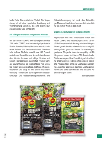 19AnzeigeGartentrendshafte Ernte. Ein zus%u00e4tzlicher Vorteil: Die Verpackung ist mit einer speziellen Auslobung und Vormarkierung versehen, die eine direkte Nutzung als Grow-Bag erm%u00f6glicht.F%u00fcr kr%u00e4ftiges Wachstum und gesunde PflanzenMit der neuen COMPO BIO Gartenpflanzenerde 75 L bietet COMPO eine hochwertige Spezialerde f%u00fcr alle Stauden, B%u00fcsche, Hecken sowie starkzehrende Balkon- und Terrassenpflanzen. Die ebenfalls torffreie Bio-Erde besteht aus 100 Prozent nat%u00fcrlichen Rohstoffen und kommt dank besonders leichter, lockerer und luftiger Struktur und hohem Holzfaseranteil auch mit 25 Prozent weniger Gewicht daher als vergleichbare 75 L-Erden. Sie f%u00f6rdert ein nachhaltiges, kr%u00e4ftiges Pflanzenwachstum und sorgt f%u00fcr eine stabile Wurzelentwicklung %u2013 unterst%u00fctzt durch optimierte Wasserf%u00fchrungs- und Wasserhalteeigenschaften. Die N%u00e4hrstoffversorgung ist dank des Naturd%u00fcnger-Mixes und des hohen Humusanteils ebenfalls f%u00fcr bis zu f%u00fcnf Wochen gesichert. Organisch, leistungsstark und preisattraktivAbgerundet wird das Aktionspaket durch den neuen COMPO BIO Rasend%u00fcnger Aktion. Der erh%u00f6hte Phosphatanteil des organischen D%u00fcngers f%u00f6rdert gezielt das Wurzelwachstum und sorgt f%u00fcr einen gr%u00fcnen, gesunden Rasen. Der streuwagengeeignete D%u00fcnger ist besonders ergiebig: mit 20 Kilogramm lassen sich bis zu 500 Quadratmeter Fl%u00e4che versorgen. Das Produkt eignet sich ideal f%u00fcr anspruchsvolle Hobbyg%u00e4rtner, die auf nat%u00fcrliche Pflege setzen, ohne auf Leistung zu verzichten. Auch hier %u00fcberzeugt das Preis-Leistungs-Verh%u00e4ltnis und bietet dem Handel eine exklusive Positionierung im Markt.www.compo.de