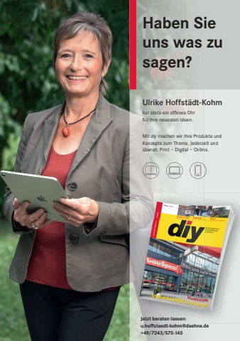 Ulrike Hoffst%u00e4dt-Kohm hat stets ein offenes Ohr f%u00fcr Ihre neuesten Ideen.Mit diy machen wir Ihre Produkte und Konzepte zum Thema. Jederzeit und %u00fcberall: Print %u2013 Digital %u2013 Online.Haben Sie uns was zu sagen?Jetzt beraten lassen:u.hoffstaedt-kohm@daehne.de+49/7243/575-145