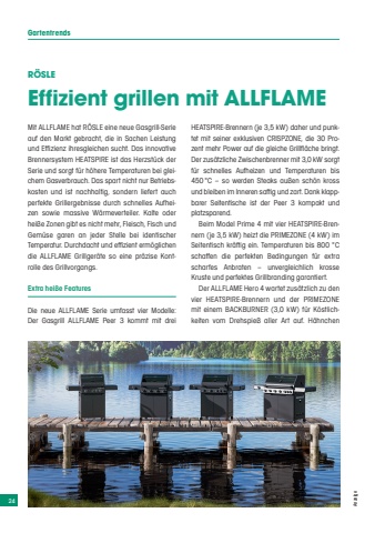 24AnzeigeGartentrendsR%u00d6SLEEffizient grillen mit ALLFLAMEMit ALLFLAME hat R%u00d6SLE eine neue Gasgrill-Serie auf den Markt gebracht, die in Sachen Leistung und Effizienz ihresgleichen sucht. Das innovative Brennersystem HEATSPIRE ist das Herzst%u00fcck der Serie und sorgt f%u00fcr h%u00f6here Temperaturen bei gleichem Gasverbrauch. Das spart nicht nur Betriebskosten und ist nachhaltig, sondern liefert auch perfekte Grillergebnisse durch schnelles Aufheizen sowie massive W%u00e4rmeverteiler. Kalte oder hei%u00dfe Zonen gibt es nicht mehr, Fleisch, Fisch und Gem%u00fcse garen an jeder Stelle bei identischer Temperatur. Durchdacht und effizient erm%u00f6glichen die ALLFLAME Grillger%u00e4te so eine pr%u00e4zise Kontrolle des Grillvorgangs. Extra hei%u00dfe FeaturesDie neue ALLFLAME Serie umfasst vier Modelle: Der Gasgrill ALLFLAME Peer 3 kommt mit drei HEATSPIRE-Brennern (je 3,5 kW) daher und punktet mit seiner exklusiven CRISPZONE, die 30 Prozent mehr Power auf die gleiche Grillfl%u00e4che bringt. Der zus%u00e4tzliche Zwischenbrenner mit 3,0 kW sorgt f%u00fcr schnelles Aufheizen und Temperaturen bis 450 %u00b0C %u2013 so werden Steaks au%u00dfen sch%u00f6n kross und bleiben im Inneren saftig und zart. Dank klappbarer Seitentische ist der Peer 3 kompakt und platzsparend. Beim Model Prime 4 mit vier HEATSPIRE-Brennern (je 3,5 kW) heizt die PRIMEZONE (4 kW) im Seitentisch kr%u00e4ftig ein. Temperaturen bis 800 %u00b0C schaffen die perfekten Bedingungen f%u00fcr extra scharfes Anbraten %u2013 unvergleichlich krosse Kruste und perfektes Grillbranding garantiert.Der ALLFLAME Hero 4 wartet zus%u00e4tzlich zu den vier HEATSPIRE-Brennern und der PRIMEZONE mit einem BACKBURNER (3,0 kW) f%u00fcr K%u00f6stlichkeiten vom Drehspie%u00df aller Art auf. H%u00e4hnchen