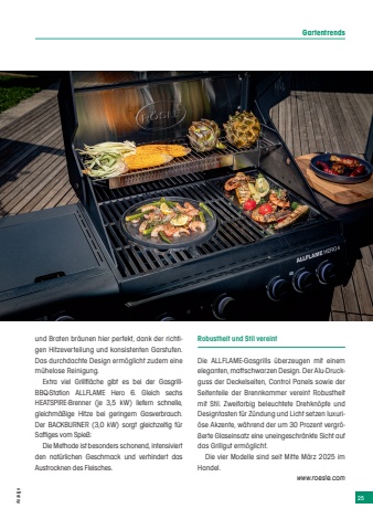 25AnzeigeGartentrendsund Braten br%u00e4unen hier perfekt, dank der richtigen Hitzeverteilung und konsistenten Garstufen. Das durchdachte Design erm%u00f6glicht zudem eine m%u00fchelose Reinigung.Extra viel Grillfl%u00e4che gibt es bei der GasgrillBBQ-Station ALLFLAME Hero 6. Gleich sechs HEATSPIRE-Brenner (je 3,5 kW) liefern schnelle, gleichm%u00e4%u00dfige Hitze bei geringem Gasverbrauch. Der BACKBURNER (3,0 kW) sorgt gleichzeitig f%u00fcr Saftiges vom Spie%u00df: Die Methode ist besonders schonend, intensiviert den nat%u00fcrlichen Geschmack und verhindert das Austrocknen des Fleisches.Robustheit und Stil vereintDie ALLFLAME-Gasgrills %u00fcberzeugen mit einem eleganten, mattschwarzen Design. Der Alu-Druckguss der Deckelseiten, Control Panels sowie der Seitenteile der Brennkammer vereint Robustheit mit Stil. Zweifarbig beleuchtete Drehkn%u00f6pfe und Designtasten f%u00fcr Z%u00fcndung und Licht setzen luxuri%u00f6se Akzente, w%u00e4hrend der um 30 Prozent vergr%u00f6%u00dferte Glaseinsatz eine uneingeschr%u00e4nkte Sicht auf das Grillgut erm%u00f6glicht.Die vier Modelle sind seit Mitte M%u00e4rz 2025 im Handel.www.roesle.com