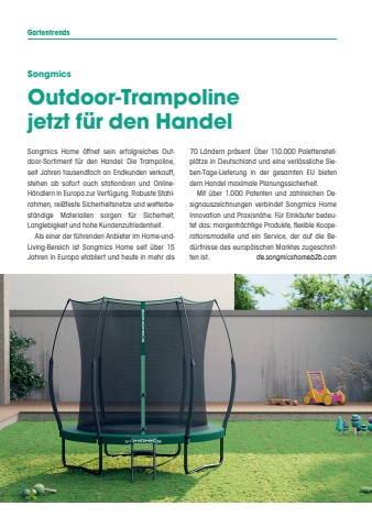 GartentrendsSongmicsOutdoor-Trampoline jetzt f%u00fcr den HandelSongmics Home %u00f6ffnet sein erfolgreiches Outdoor-Sortiment f%u00fcr den Handel: Die Trampoline, seit Jahren tausendfach an Endkunden verkauft, stehen ab sofort auch station%u00e4ren und OnlineH%u00e4ndlern in Europa zur Verf%u00fcgung. Robuste Stahlrahmen, rei%u00dffeste Sicherheitsnetze und wetterbest%u00e4ndige Materialien sorgen f%u00fcr Sicherheit, Langlebigkeit und hohe Kundenzufriedenheit.Als einer der f%u00fchrenden Anbieter im Home-undLiving-Bereich ist Songmics Home seit %u00fcber 15 Jahren in Europa etabliert und heute in mehr als 70 L%u00e4ndern pr%u00e4sent. %u00dcber 110.000 Palettenstellpl%u00e4tze in Deutschland und eine verl%u00e4ssliche Sieben-Tage-Lieferung in der gesamten EU bieten dem Handel maximale Planungssicherheit.Mit %u00fcber 1.000 Patenten und zahlreichen Designauszeichnungen verbindet Songmics Home Innovation und Praxisn%u00e4he. F%u00fcr Eink%u00e4ufer bedeutet das: margentr%u00e4chtige Produkte, flexible Kooperationsmodelle und ein Service, der auf die Bed%u00fcrfnisse des europ%u00e4ischen Marktes zugeschnitten ist.de.songmicshomeb2b.com