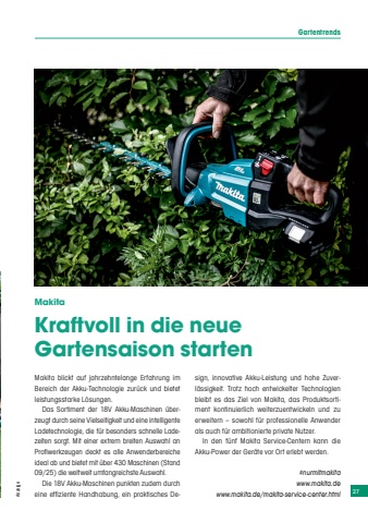 27AnzeigeGartentrendsMakitaKraftvoll in die neue Gartensaison startenMakita blickt auf jahrzehntelange Erfahrung im Bereich der Akku-Technologie zur%u00fcck und bietet leistungsstarke L%u00f6sungen.Das Sortiment der 18V Akku-Maschinen %u00fcberzeugt durch seine Vielseitigkeit und eine intelligente Ladetechnologie, die f%u00fcr besonders schnelle Ladezeiten sorgt. Mit einer extrem breiten Auswahl an Profiwerkzeugen deckt es alle Anwenderbereiche ideal ab und bietet mit %u00fcber 430 Maschinen (Stand 09/25) die weltweit umfangreichste Auswahl.Die 18V Akku-Maschinen punkten zudem durch eine effiziente Handhabung, ein praktisches Design, innovative Akku-Leistung und hohe Zuverl%u00e4ssigkeit. Trotz hoch entwickelter Technologien bleibt es das Ziel von Makita, das Produktsortiment kontinuierlich weiterzuentwickeln und zu erweitern %u2013 sowohl f%u00fcr professionelle Anwender als auch f%u00fcr ambitionierte private Nutzer.In den f%u00fcnf Makita Service-Centern kann die Akku-Power der Ger%u00e4te vor Ort erlebt werden. #nurmitmakitawww.makita.dewww.makita.de/makita-service-center.html