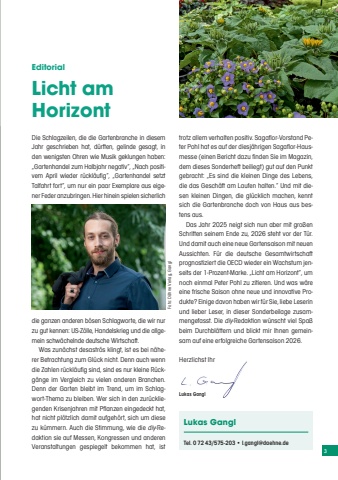 3EditorialLicht am HorizontDie Schlagzeilen, die die Gartenbranche in diesem Jahr geschrieben hat, d%u00fcrften, gelinde gesagt, in den wenigsten Ohren wie Musik geklungen haben: %u201eGartenhandel zum Halbjahr negativ%u201c, %u201eNach positivem April wieder r%u00fcckl%u00e4ufig%u201c, %u201eGartenhandel setzt Talfahrt fort%u201c, um nur ein paar Exemplare aus eigener Feder anzubringen. Hier hinein spielen sicherlich die ganzen anderen b%u00f6sen Schlagworte, die wir nur zu gut kennen: US-Z%u00f6lle, Handelskrieg und die allgemein schw%u00e4chelnde deutsche Wirtschaft.Was zun%u00e4chst desastr%u00f6s klingt, ist es bei n%u00e4herer Betrachtung zum Gl%u00fcck nicht. Denn auch wenn die Zahlen r%u00fcckl%u00e4ufig sind, sind es nur kleine R%u00fcckg%u00e4nge im Vergleich zu vielen anderen Branchen. Denn der Garten bleibt im Trend, um im Schlagwort-Thema zu bleiben. Wer sich in den zur%u00fcckliegenden Krisenjahren mit Pflanzen eingedeckt hat, hat nicht pl%u00f6tzlich damit aufgeh%u00f6rt, sich um diese zu k%u00fcmmern. Auch die Stimmung, wie die diy-Redaktion sie auf Messen, Kongressen und anderen Veranstaltungen gespiegelt bekommen hat, ist trotz allem verhalten positiv. Sagaflor-Vorstand Peter Pohl hat es auf der diesj%u00e4hrigen Sagaflor-Hausmesse (einen Bericht dazu finden Sie im Magazin, dem dieses Sonderheft beiliegt) gut auf den Punkt gebracht: %u201eEs sind die kleinen Dinge des Lebens, die das Gesch%u00e4ft am Laufen halten.%u201c Und mit diesen kleinen Dingen, die gl%u00fccklich machen, kennt sich die Gartenbranche doch von Haus aus bestens aus. Das Jahr 2025 neigt sich nun aber mit gro%u00dfen Schritten seinem Ende zu, 2026 steht vor der T%u00fcr. Und damit auch eine neue Gartensaison mit neuen Aussichten. F%u00fcr die deutsche Gesamtwirtschaft prognostiziert die OECD wieder ein Wachstum jenseits der 1-Prozent-Marke. %u201eLicht am Horizont%u201c, um noch einmal Peter Pohl zu zitieren. Und was w%u00e4re eine frische Saison ohne neue und innovative Produkte? Einige davon haben wir f%u00fcr Sie, liebe Leserin und lieber Leser, in dieser Sonderbeilage zusammengefasst. Die diy-Redaktion w%u00fcnscht viel Spa%u00df beim Durchbl%u00e4ttern und blickt mir Ihnen gemeinsam auf eine erfolgreiche Gartensaison 2026.Herzlichst IhrLukas GanglLukas GanglTel. 0 72 43/575-203 %u2022 l.gangl@daehne.de Foto: D%u00e4hne Verlag, Gangl