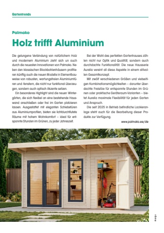AnzeigeGartentrendsPalmakoHolz trifft AluminiumDie gelungene Verbindung von nat%u00fcrlichem Holz und modernem Aluminium zieht sich un auch durch die neuesten Innovationen von Palmako. Neben den klassischen Blockbohlenh%u00e4usern profitieren k%u00fcnftig auch die neuen Modelle in Elementbauweise von robusten, wartungsfreien Aluminiumt%u00fcren und -fenstern, die nicht nur funktional %u00fcberzeugen, sondern auch optisch Akzente setzen.Ein besonderes Highlight sind die neuen Winterg%u00e4rten, die sich flexibel an eine bestehende Hauswand anschlie%u00dfen oder frei im Garten platzieren lassen. Ausgestattet mit eleganten Schiebet%u00fcren aus Aluminiumprofilen, bieten sie lichtdurchflutete R%u00e4ume mit hohem Wohnkomfort %u2013 ideal f%u00fcr entspannte Stunden im Gr%u00fcnen, zu jeder Jahreszeit.Bei der Wahl des perfekten Gartenhauses z%u00e4hlen nicht nur Optik und Qualit%u00e4t, sondern auch durchdachte Funktionalit%u00e4t. Die neue Hausserie Aurelia vereint all diese Aspekte in einem stilvollen Gesamtkonzept.Mit zw%u00f6lf verschiedenen Gr%u00f6%u00dfen und vielseitigen Kombinationsm%u00f6glichkeiten %u2013 darunter %u00fcberdachte Freisitze f%u00fcr entspannte Stunden im Gr%u00fcnen oder praktische Ger%u00e4teraum-Varianten %u2013 bietet Aurelia maximale Flexibilit%u00e4t f%u00fcr jeden Garten und Anspruch.Die seit 2025 in Betrieb befindliche Lackieranlage steht auch f%u00fcr die Bearbeitung dieser Produkte zur Verf%u00fcgung. www.palmako.ee/de