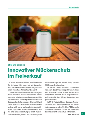 33AnzeigeGartentrendsSBM Life ScienceInnovativer M%u00fcckenschutz im FreiverkaufDie Marke Thermacell steht f%u00fcr eine m%u00fcckenfreie Zeit im Freien. Jetzt kommt die seit Jahren bew%u00e4hrte M%u00fcckenabwehr in neuem Design und mit einem innovativen Wirkstoff auf den Markt. Die neuen Ger%u00e4te %u00fcberzeugen durch eine gl%u00e4nzende Oberfl%u00e4che in Wei%u00df oder Schwarz, jeweils kombiniert mit einem gr%u00fcnen Designelement. Die freiverk%u00e4uflichen Wirkstoffpl%u00e4ttchen werden auf Basis von Eucalyptus citriodora %u00d6l hergestellt und bieten eine 15 m%u00b2 Schutzzone vor Stechm%u00fccken und der sich immer weiterverbreitenden Asiatischen Tigerm%u00fccke. Jedes Thermacell-Ger%u00e4t wird mit einer Grundausstattung f%u00fcr zw%u00f6lf m%u00fcckenfreie Stunden ausgeliefert. Je nach Bedarf gibt es Nachf%u00fcllpackungen f%u00fcr weitere zw%u00f6lf, 48 oder 120 Stunden M%u00fcckenschutz.Die neuen Thermacell-Ger%u00e4te funktionieren nach dem bew%u00e4hrten Prinzip: Mit einem Dreh wird eine Gaskartusche aktiviert, die ein Wirkstoffpl%u00e4ttchen erw%u00e4rmt. Der so freigesetzte Wirkstoff sorgt daf%u00fcr, dass M%u00fccken stundenlang ferngehalten werden. Als PT 19-Produkte k%u00f6nnen die neuen Thermacell-Ger%u00e4te und Nachf%u00fcllpackungen im Freiverkauf angeboten werden. Attraktive POS-Konzepte und Zweitplatzierungen machen den Kunden auf den innovativen M%u00fcckenschutz aufmerksam.www.seezon.de