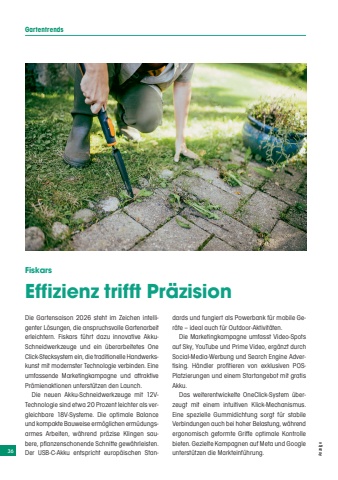 GartentrendsFiskarsEffizienz trifft Pr%u00e4zisionDie Gartensaison 2026 steht im Zeichen intelligenter L%u00f6sungen, die anspruchsvolle Gartenarbeit erleichtern. Fiskars f%u00fchrt dazu innovative AkkuSchneidwerkzeuge und ein %u00fcberarbeitetes OneClick-Stecksystem ein, die traditionelle Handwerkskunst mit modernster Technologie verbinden. Eine umfassende Marketingkampagne und attraktive Pr%u00e4mienaktionen unterst%u00fctzen den Launch.Die neuen Akku-Schneidwerkzeuge mit 12VTechnologie sind etwa 20 Prozent leichter als vergleichbare 18V-Systeme. Die optimale Balance und kompakte Bauweise erm%u00f6glichen erm%u00fcdungsarmes Arbeiten, w%u00e4hrend pr%u00e4zise Klingen saubere, pflanzenschonende Schnitte gew%u00e4hrleisten. Der USB-C-Akku entspricht europ%u00e4ischen Standards und fungiert als Powerbank f%u00fcr mobile Ger%u00e4te %u2013 ideal auch f%u00fcr Outdoor-Aktivit%u00e4ten.Die Marketingkampagne umfasst Video-Spots auf Sky, YouTube und Prime Video, erg%u00e4nzt durch Social-Media-Werbung und Search Engine Advertising. H%u00e4ndler profitieren von exklusiven POSPlatzierungen und einem Startangebot mit gratis Akku.Das weiterentwickelte OneClick-System %u00fcberzeugt mit einem intuitiven Klick-Mechanismus. Eine spezielle Gummidichtung sorgt f%u00fcr stabile Verbindungen auch bei hoher Belastung, w%u00e4hrend ergonomisch geformte Griffe optimale Kontrolle bieten. Gezielte Kampagnen auf Meta und Google unterst%u00fctzen die Markteinf%u00fchrung.Anzeige36