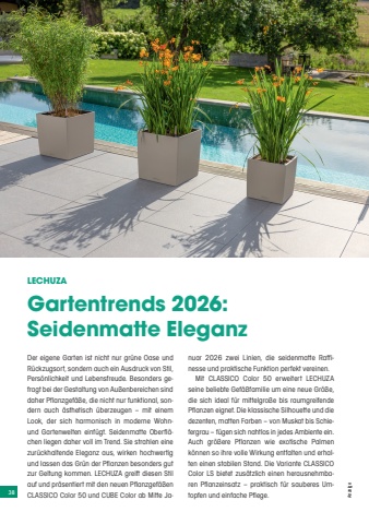 38AnzeigeLECHUZAGartentrends 2026: Seidenmatte EleganzDer eigene Garten ist nicht nur gr%u00fcne Oase und R%u00fcckzugsort, sondern auch ein Ausdruck von Stil, Pers%u00f6nlichkeit und Lebensfreude. Besonders gefragt bei der Gestaltung von Au%u00dfenbereichen sind daher Pflanzgef%u00e4%u00dfe, die nicht nur funktional, sondern auch %u00e4sthetisch %u00fcberzeugen %u2013 mit einem Look, der sich harmonisch in moderne Wohnund Gartenwelten einf%u00fcgt. Seidenmatte Oberfl%u00e4chen liegen daher voll im Trend. Sie strahlen eine zur%u00fcckhaltende Eleganz aus, wirken hochwertig und lassen das Gr%u00fcn der Pflanzen besonders gut zur Geltung kommen. LECHUZA greift diesen Stil auf und pr%u00e4sentiert mit den neuen Pflanzgef%u00e4%u00dfen CLASSICO Color 50 und CUBE Color ab Mitte Januar 2026 zwei Linien, die seidenmatte Raffinesse und praktische Funktion perfekt vereinen. Mit CLASSICO Color 50 erweitert LECHUZA seine beliebte Gef%u00e4%u00dffamilie um eine neue Gr%u00f6%u00dfe, die sich ideal f%u00fcr mittelgro%u00dfe bis raumgreifende Pflanzen eignet. Die klassische Silhouette und die dezenten, matten Farben %u2013 von Muskat bis Schiefergrau %u2013 f%u00fcgen sich nahtlos in jedes Ambiente ein. Auch gr%u00f6%u00dfere Pflanzen wie exotische Palmen k%u00f6nnen so ihre volle Wirkung entfalten und erhalten einen stabilen Stand. Die Variante CLASSICO Color LS bietet zus%u00e4tzlich einen herausnehmbaren Pflanzeinsatz %u2013 praktisch f%u00fcr sauberes Umtopfen und einfache Pflege.