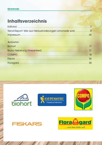 GartentrendsInhaltsverzeichnisEditorial . . . . . . . . . . . . . . . . . . . . . . . . . . . . . . . . . . . . . . . . . . . . . . . . . . . . . . . . . . . . . 3Trend-Report: Wie aus Herausforderungen Limonade wird . . . . . . . . . . . . . 8Impressum . . . . . . . . . . . . . . . . . . . . . . . . . . . . . . . . . . . . . . . . . . . . . . . . . . . . . . . . . 42Biohort . . . . . . . . . . . . . . . . . . . . . . . . . . . . . . . . . . . . . . . . . . . . . . . . . . . . . . . . . . . . .17Bruno Nebelung (Kiepenkerl). . . . . . . . . . . . . . . . . . . . . . . . . . . . . . . . . . . . . . . 21COMPO . . . . . . . . . . . . . . . . . . . . . . . . . . . . . . . . . . . . . . . . . . . . . . . . . . . . . . . . . . . 18Fiskars . . . . . . . . . . . . . . . . . . . . . . . . . . . . . . . . . . . . . . . . . . . . . . . . . . . . . . . . . . . . . 36Floragard. . . . . . . . . . . . . . . . . . . . . . . . . . . . . . . . . . . . . . . . . . . . . . . . . . . . . . . . . . 28
