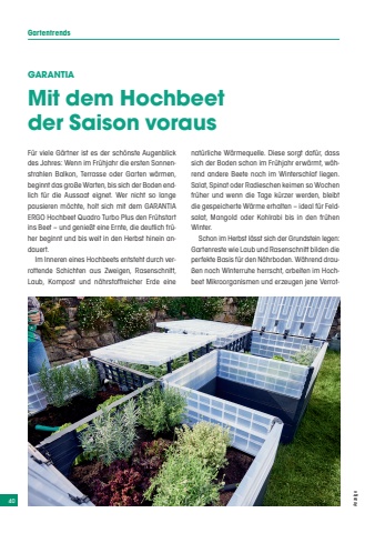40AnzeigeGartentrendsGARANTIAMit dem Hochbeet der Saison vorausF%u00fcr viele G%u00e4rtner ist es der sch%u00f6nste Augenblick des Jahres: Wenn im Fr%u00fchjahr die ersten Sonnenstrahlen Balkon, Terrasse oder Garten w%u00e4rmen, beginnt das gro%u00dfe Warten, bis sich der Boden endlich f%u00fcr die Aussaat eignet. Wer nicht so lange pausieren m%u00f6chte, holt sich mit dem GARANTIA ERGO Hochbeet Quadro Turbo Plus den Fr%u00fchstart ins Beet %u2013 und genie%u00dft eine Ernte, die deutlich fr%u00fcher beginnt und bis weit in den Herbst hinein andauert.Im Inneren eines Hochbeets entsteht durch verrottende Schichten aus Zweigen, Rasenschnitt, Laub, Kompost und n%u00e4hrstoffreicher Erde eine nat%u00fcrliche W%u00e4rmequelle. Diese sorgt daf%u00fcr, dass sich der Boden schon im Fr%u00fchjahr erw%u00e4rmt, w%u00e4hrend andere Beete noch im Winterschlaf liegen. Salat, Spinat oder Radieschen keimen so Wochen fr%u00fcher und wenn die Tage k%u00fcrzer werden, bleibt die gespeicherte W%u00e4rme erhalten %u2013 ideal f%u00fcr Feldsalat, Mangold oder Kohlrabi bis in den fr%u00fchen Winter.Schon im Herbst l%u00e4sst sich der Grundstein legen: Gartenreste wie Laub und Rasenschnitt bilden die perfekte Basis f%u00fcr den N%u00e4hrboden. W%u00e4hrend drau%u00dfen noch Winterruhe herrscht, arbeiten im Hochbeet Mikroorganismen und erzeugen jene Verrot-
