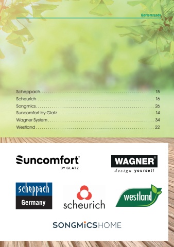 GartentrendsScheppach. . . . . . . . . . . . . . . . . . . . . . . . . . . . . . . . . . . . . . . . . . . . . . . . . . . . . . . . 15Scheurich . . . . . . . . . . . . . . . . . . . . . . . . . . . . . . . . . . . . . . . . . . . . . . . . . . . . . . . . . 16Songmics. . . . . . . . . . . . . . . . . . . . . . . . . . . . . . . . . . . . . . . . . . . . . . . . . . . . . . . . . . 26Suncomfort by Glatz . . . . . . . . . . . . . . . . . . . . . . . . . . . . . . . . . . . . . . . . . . . . . . . 14Wagner System . . . . . . . . . . . . . . . . . . . . . . . . . . . . . . . . . . . . . . . . . . . . . . . . . . . . 34Westland . . . . . . . . . . . . . . . . . . . . . . . . . . . . . . . . . . . . . . . . . . . . . . . . . . . . . . . . . . 22