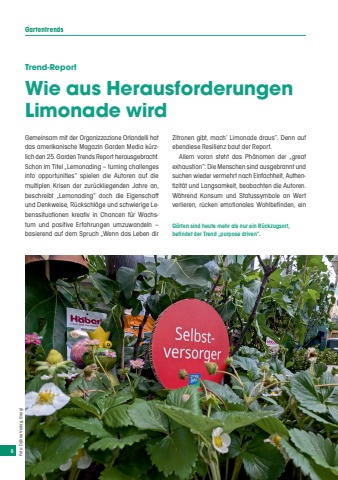 8GartentrendsTrend-ReportWie aus Herausforderungen Limonade wirdGemeinsam mit der Organizzazione Orlandelli hat das amerikanische Magazin Garden Media k%u00fcrzlich den 25. Garden Trends Report herausgebracht. Schon im Titel %u201eLemonading %u2013 turning challenges into opportunities%u201c spielen die Autoren auf die multiplen Krisen der zur%u00fcckliegenden Jahre an, beschreibt %u201eLemonading%u201c doch die Eigenschaft und Denkweise, R%u00fcckschl%u00e4ge und schwierige Lebenssituationen kreativ in Chancen f%u00fcr Wachstum und positive Erfahrungen umzuwandeln %u2013 basierend auf dem Spruch %u201eWenn das Leben dir Zitronen gibt, mach%u2018 Limonade draus%u201c. Denn auf ebendiese Resilienz baut der Report.Allem voran steht das Ph%u00e4nomen der %u201egreat exhaustion%u201c: Die Menschen sind ausgebrannt und suchen wieder vermehrt nach Einfachheit, Authentizit%u00e4t und Langsamkeit, beobachten die Autoren. W%u00e4hrend Konsum und Statussymbole an Wert verlieren, r%u00fccken emotionales Wohlbefinden, ein G%u00e4rten sind heute mehr als nur ein R%u00fcckzugsort, befindet der Trend %u201epurpose driven%u201c.Foto: D%u00e4hne Verlag, Gangl