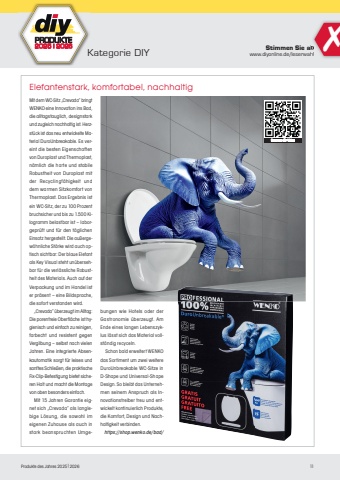 Produkte des Jahres 2025|202611PRODUKTE2025I2026Stimmen Sie abKategorie DIYwww.diyonline.de/leserwahl%u001aElefantenstark, komfortabel, nachhaltigMit dem WC-Sitz %u201eCrevada%u201c bringt WENKO eine Innovation ins Bad, die alltagstauglich, designstark und zugleich nachhaltig ist. Herzst%u00fcck ist das neu entwickelte Material DuroUnbreakable. Es vereint die besten Eigenschaften von Duroplast und Thermoplast, n%u00e4mlich die harte und stabile Robustheit von Duroplast mit der Recyclingf%u00e4higkeit und dem warmen Sitzkomfort von Thermoplast. Das Ergebnis ist ein WC-Sitz, der zu 100 Prozent bruchsicher und bis zu 1.500 Kilogramm belastbar ist %u2013 laborgepr%u00fcft und f%u00fcr den t%u00e4glichen Einsatz hergestellt. Die au%u00dfergew%u00f6hnliche St%u00e4rke wird auch optisch sichtbar: Der blaue Elefant als Key Visual steht un%u00fcbersehbar f%u00fcr die verl%u00e4ssliche Robustheit des Materials. Auch auf der Verpackung und im Handel ist er pr%u00e4sent %u2013 eine Bildsprache, die sofort verstanden wird.%u201eCrevada%u201c %u00fcberzeugt im Alltag: Die porenfreie Oberfl%u00e4che ist hygienisch und einfach zu reinigen, farbecht und resistent gegen Vergilbung %u2013 selbst nach vielen Jahren. Eine integrierte Absenkautomatik sorgt f%u00fcr leises und sanftes Schlie%u00dfen, die praktische Fix-Clip-Befestigung bietet sicheren Halt und macht die Montage von oben besonders einfach.Mit 15 Jahren Garantie eignet sich %u201eCrevada%u201c als langlebige L%u00f6sung, die sowohl im eigenen Zuhause als auch in stark beanspruchten Umgebungen wie Hotels oder der Gastronomie %u00fcberzeugt. Am Ende eines langen Lebenszyklus l%u00e4sst sich das Material vollst%u00e4ndig recyceln.Schon bald erweitert WENKO das Sortiment um zwei weitere DuroUnbreakable WC-Sitze in D-Shape und Universal-Shape Design. So bleibt das Unternehmen seinem Anspruch als Innovationstreiber treu und entwickelt kontinuierlich Produkte, die Komfort, Design und Nachhaltigkeit verbinden.https://shop.wenko.de/bad/Scannen f%u00fcr Videocannen f%u00fcr Video