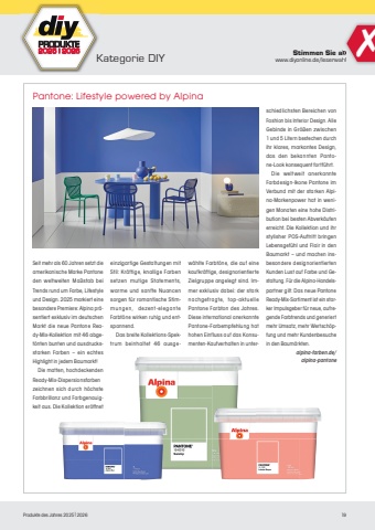 Produkte des Jahres 2025|202619PRODUKTE2025I2026Stimmen Sie abKategorie DIYwww.diyonline.de/leserwahl%u001aPantone: Lifestyle powered by Alpina Seit mehr als 60 Jahren setzt die amerikanische Marke Pantone den weltweiten Ma%u00dfstab bei Trends rund um Farbe, Lifestyle und Design. 2025 markiert eine besondere Premiere: Alpina pr%u00e4sentiert exklusiv im deutschen Markt die neue Pantone Ready-Mix-Kollektion mit 46 abget%u00f6nten bunten und ausdrucksstarken Farben %u2013 ein echtes Highlight in jedem Baumarkt!Die matten, hochdeckenden Ready-Mix-Dispersionsfarben zeichnen sich durch h%u00f6chste Farbbrillanz und Farbgenauigkeit aus. Die Kollektion er%u00f6ffnet einzigartige Gestaltungen mit Stil: Kr%u00e4ftige, knallige Farben setzen mutige State ments, warme und sanfte Nuancen sorgen f%u00fcr romantische Stimmungen, dezent- elegante Farbt%u00f6ne wirken ruhig und entspannend.Das breite Kollektions-Spektrum beinhaltet 46 ausgew%u00e4hlte Farbt%u00f6ne, die auf eine kaufkr%u00e4ftige, designorientierte Zielgruppe angelegt sind. Immer exklusiv dabei: der stark nachgefragte, top - aktuelle Pantone Farbton des Jahres. Diese international anerkannte Pantone-Farbempfehlung hat hohen Einfluss auf das Konsumenten-Kaufverhalten in unterschiedlichsten Bereichen von Fashion bis Interior Design. Alle Gebinde in Gr%u00f6%u00dfen zwischen 1 und 5 Litern bestechen durch ihr klares, markantes Design, das den bekannten Pantone-Look konsequent fortf%u00fchrt. Die weltweit anerkannte Farbdesign-Ikone Pantone im Verbund mit der starken Alpina-Markenpower hat in wenigen Monaten eine hohe Distribution bei besten Abverk%u00e4ufen erreicht. Die Kollektion und ihr stylisher POS-Auftritt bringen Lebensgef%u00fchl und Flair in den Baumarkt %u2013 und machen insbesondere designorientierten Kunden Lust auf Farbe und Gestaltung. F%u00fcr die Alpina-Handelspartner gilt: Das neue Pantone Ready-Mix-Sortiment ist ein starker Impulsgeber f%u00fcr neue, aufregende Farbtrends und generiert mehr Umsatz, mehr Wertsch%u00f6pfung und mehr Kundenbesuche in den Baum%u00e4rkten.alpina-farben.de/alpina-pantone