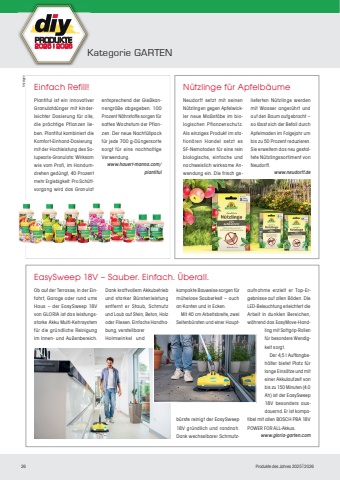 26Produkte des Jahres 20252026PRODUKTE2025I2026Kategorie GARTENEinfach Refill!Plantiful ist ein innovativer Granulatd%u00fcnger mit kinderleichter Dosierung f%u00fcr alle, die pr%u00e4chtige Pflanzen lieben. Plantiful kombiniert die Komfort-Einhand-Dosierung mit der Hochleistung des Solupearls-Granulats: Wirksam wie vom Profi, im Handumdrehen ged%u00fcngt, 40 Prozent mehr Ergiebigkeit: Pro Sch%u00fcttvorgang wird das Granulat entsprechend der Gie%u00dfkannengr%u00f6%u00dfe abgegeben. 100 Prozent N%u00e4hrstoffe sorgen f%u00fcr sattes Wachstum der Pflanzen. Der neue Nachf%u00fcllpack f%u00fcr jede 700 g-D%u00fcngersorte sorgt f%u00fcr eine nachhaltige Verwendung.www.hauert-manna.com/ plantifulEasySweep 18V %u2013 Sauber. Einfach. %u00dcberall.Ob auf der Terrasse, in der Einfahrt, Garage oder rund ums Haus %u2013 der EasySweep 18V von GLORIA ist das leistungsstarke Akku Multi-Kehrsystem f%u00fcr die gr%u00fcndliche Reinigung im Innen- und Au%u00dfenbereich. Dank kraftvollem Akkubetrieb und starker B%u00fcrstenleistung entfernt er Staub, Schmutz und Laub auf Stein, Beton, Holz oder Fliesen. Einfache Handhabung, verstellbarer Holmwinkel und kompakte Bauweise sorgen f%u00fcr m%u00fchelose Sauberkeit %u2013 auch an Kanten und in Ecken.Mit 40 cm Arbeitsbreite, zwei Seitenb%u00fcrsten und einer Hauptb%u00fcrste reinigt der EasySweep 18V gr%u00fcndlich und randnah. Dank wechselbarer Schmutzaufnahme erzielt er Top-Ergebnisse auf allen B%u00f6den. Die LED-Beleuchtung erleichtert die Arbeit in dunklen Bereichen, w%u00e4hrend das EasyMove-Handling mit Softgrip-Rollen f%u00fcr besondere Wendigkeit sorgt.Der 4,5 l Auffangbeh%u00e4lter bietet Platz f%u00fcr lange Eins%u00e4tze und mit einer Akkulaufzeit von bis zu 150 Minuten (4.0 Ah) ist der EasySweep 18V besonders ausdauernd. Er ist kompatibel mit allen BOSCH PBA 18V POWER FOR ALL-Akkus. www.gloria-garten.comN%u00fctzlinge f%u00fcr Apfelb%u00e4umeNeudorff setzt mit seinen N%u00fctzlingen gegen Apfelwickler neue Ma%u00dfst%u00e4be im biologischen Pflanzenschutz. Als einziges Produkt im station%u00e4ren Handel setzt es SF-Nematoden f%u00fcr eine rein biologische, einfache und nachweislich wirksame Anwendung ein. Die frisch gelieferten N%u00fctzlinge werden mit Wasser anger%u00fchrt und auf den Baum aufgebracht %u2013 so l%u00e4sst sich der Befall durch Apfelmaden im Folgejahr um bis zu 50 Prozent reduzieren. Sie erweitern das neu gestaltete N%u00fctzlingssortiment von Neudorff.www.neudorff.deAnzeigen