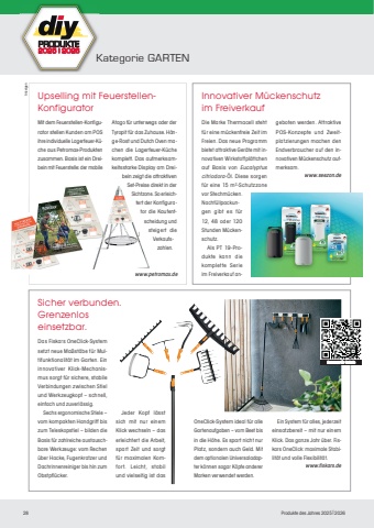 28Produkte des Jahres 20252026AnzeigenPRODUKTE2025I2026Kategorie GARTENInnovativer M%u00fcckenschutz im FreiverkaufDie Marke Thermacell steht f%u00fcr eine m%u00fcckenfreie Zeit im Freien. Das neue Programm bietet attraktive Ger%u00e4te mit innovativen Wirkstoffpl%u00e4ttchen auf Basis von Eucalyptus citriodora-%u00d6l. Diese sorgen f%u00fcr eine 15 m%u00b2-Schutzzone vor Stechm%u00fccken. Nachf%u00fcllpackungen gibt es f%u00fcr 12, 48 oder 120 Stunden M%u00fcckenschutz.Als PT 19-Produkte kann die komplette Serie im Freiverkauf angeboten werden. Attraktive POS-Konzepte und Zweitplatzierungen machen den Endverbraucher auf den innovativen M%u00fcckenschutz aufmerksam.www.seezon.deSicher verbunden. Grenzenlos einsetzbar.Das Fiskars OneClick-System setzt neue Ma%u00dfst%u00e4be f%u00fcr Multifunktionalit%u00e4t im Garten. Ein innovativer Klick-Mechanismus sorgt f%u00fcr sichere, stabile Verbindungen zwischen Stiel und Werkzeugkopf %u2013 schnell, einfach und zuverl%u00e4ssig. Sechs ergonomische Stiele %u2013 vom kompakten Handgriff bis zum Teleskopstiel %u2013 bilden die Basis f%u00fcr zahlreiche austauschbare Werkzeuge: vom Rechen %u00fcber Hacke, Fugenkratzer und Dachrinnenreiniger bis hin zum Obstpfl%u00fccker.Jeder Kopf l%u00e4sst sich mit nur einem Klick wechseln %u2013 das erleichtert die Arbeit, spart Zeit und sorgt f%u00fcr maximalen Komfor t. Leicht, stabil und vielseitig ist das OneClick-System ideal f%u00fcr alle Gartenaufgaben %u2013 vom Beet bis in die H%u00f6he. Es spart nicht nur Platz, sondern auch Geld. Mit dem optionalen Universaladapter k%u00f6nnen sogar K%u00f6pfe anderer Marken verwendet werden.Ein System f%u00fcr alles, jederzeit einsatzbereit %u2013 mit nur einem Klick. Das ganze Jahr %u00fcber. Fiskars OneClick: maximale Stabilit%u00e4t und volle Flexibilit%u00e4t.www.fiskars.deUpselling mit FeuerstellenKonfiguratorMit dem Feuerstellen-Konfigurator stellen Kunden am POS ihre individuelle Lagerfeuer-K%u00fcche aus Petromax-Produkten zusammen. Basis ist ein Dreibein mit Feuerstelle: der mobile Atago f%u00fcr unterwegs oder der Tyropit f%u00fcr das Zuhause. H%u00e4nge-Rost und Dutch Oven machen die Lagerfeuer-K%u00fcche komplett. Das aufmerksamkeitsstarke Display am Dreibein zeigt die attraktiven Set-Preise direkt in der Sichtzone. So erleichtert der Konfigurator die Kaufentscheidung und steigert die Verkaufszahlen.www.petromax.deScannen f%u00fcr Galeriecannenf%u00fcrGalere