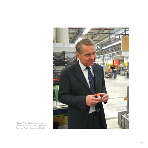 Magnus Yngen bei seinem ersten Besuch in Ulm mit „dem“ typischen Gardena-Produkt in seinen Händen 223 Gardena_Buch_Inhalt.indd 223 09.03.2016 13:14:09